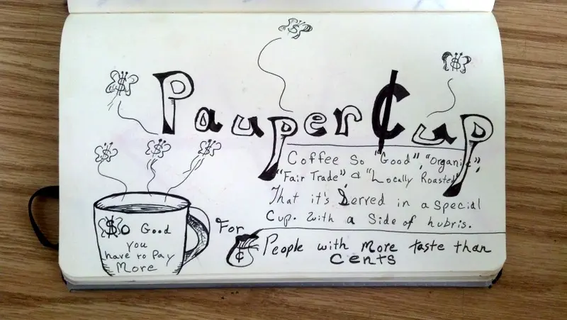 Yay! More Coffee Doodles! This one is a sad doodle though. We are stuck in a wonderful economic downturn. Cost of everything is rising. including hoity toity coffee. I’m alright paying more for good coffee. If its organic, fair trade ect. The problem is when the coffee prices go so far north they need a parka. The final version of Pauper Cup will probably have one slogan. Vote for which one you like the most in the comments!