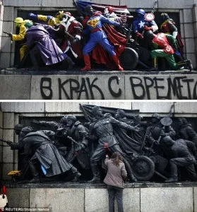 An unknown graffiti artist has transformed a statue of Russian Red Army soldiers into superheros and American icons. Superman takes center, while Santa Clause and Ronald McDonald were at his side, and others surround him. Below the statue, The phrase “Rolling with Time” was spray-painted underneath.