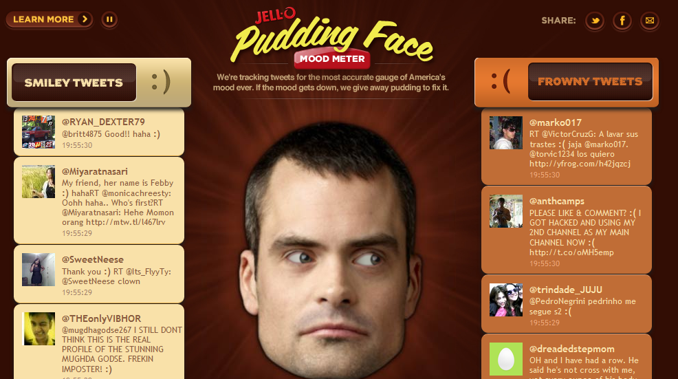 Jell-O has taken the mood ring to an unhealthy level. The odd floating head reacts to the overall happiness of the people on twitter who follow it.