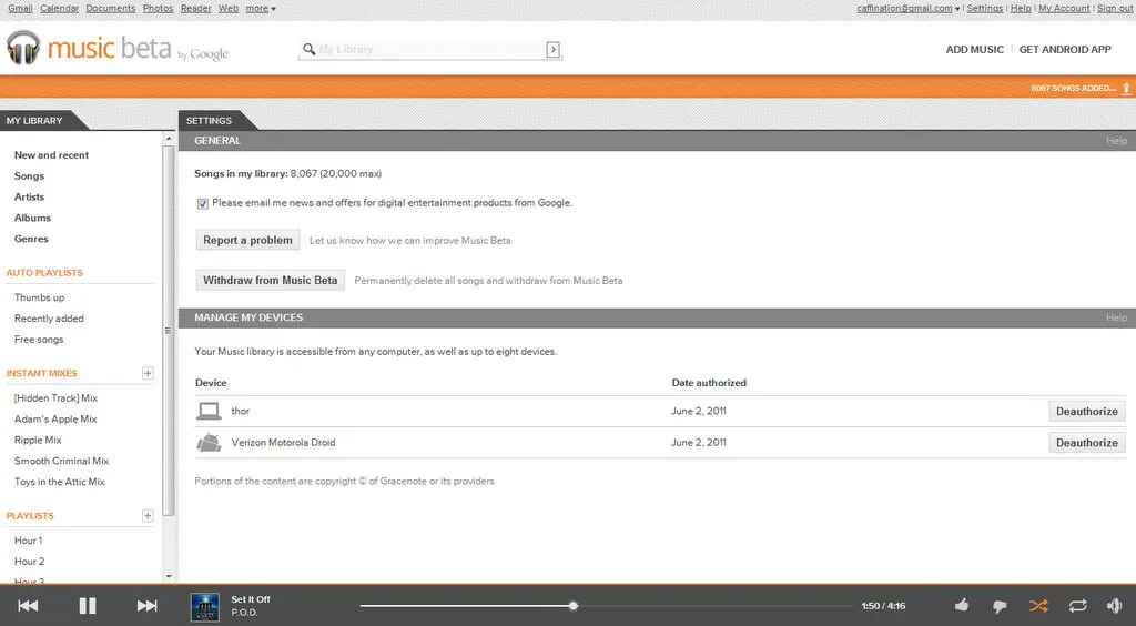 Google Music does integrate with iTunes nicely, even importing all music and playlists directly from your existing library. But if you bought any music from Apple way back when they were the champion of DRM you won’t be able to use that music in anything but iTunes. Yes you can pay Apple 30 cents per song to free your music, for me that would be able $87 dollars to free the 289 songs we have in our library from those dark times when both my wife and I had iPods, gift cards and those wonderful Pepsi giveaways. Yes we could burn each song to a CD and rip the CD back into the library and free them but this is beyond the point. That is just annoying, and would take roughly 41 or 42 CD’s. But all new music you buy from iTunes works quite well in this application.