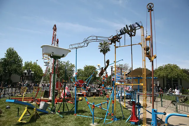 Learn about kinetics, the art of making things go. This traveling road show is looking for the funding to bring a larger than life scale model of the game Mousetrap to a town near you. While I think this is pretty incredible I’m not sure if the attraction of a single mousetrap will be enough cheese to lure people to come and see it. Perhaps a coupling with a life-size version of Monopoloy as well? About time people learned about fiscal responsibility. Still looks neat.