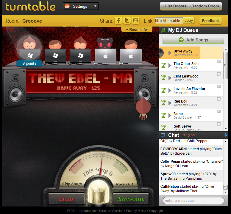 There is a new kid on the music block. And I don’t mean a boy band craze you have to run away from… unless you wander into a bad room. Turntable.fm is a new service currently in limited / not limited beta. If you have a friend who is in the beta on facebook sign in and you’re golden. If you don’t have a friend you could either request an invite, or Like the CaffiNation, and request to be my buddy. And then you get in. Easy Peezy.