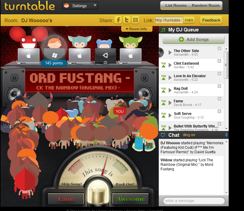 You get to search things already uploaded, and add your own songs to the mix. The you play a single song. If people like your song it gets voted up, if they don’t it gets voted down. 5 people get to DJ in a room. each one picking a single song in a row. However you need to have good music taste. I have, shall we say, very eclectic music taste I play what I feel like at the moment. I am horrible at staying on point. My personal collection and playlist verifies this on more than one occasion. A picture of my room is above. Look below to find someone with better music taste than I… DJ Woooooo was apparently “spinning some fat beats” or at least thats what the kids tell me to say he was doing. Woooo Indeed.