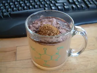 Mug with Caffeine Molecule on outside… a must. Boiling hot water water add both powders into mixture