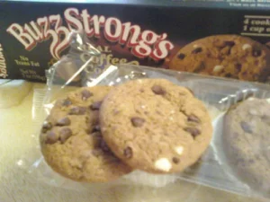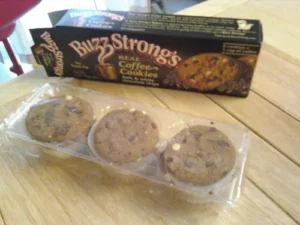 As I was wandering the aisles of our local megamart with my wife doing the weekly grocery shopping, my wife spotted the BuzzStrong’s Real Coffee Cookies. Now being a fan of the Caffination Podcast, I could not pass up the opportunity to get these and pass on the wonderful news. We purchased a box and when we got home I opened them up to check to see if they are as advertised. 4 cookies = 1 cup of coffee. Well, I’ll bit (pun intended).
