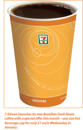 “To encourage coffee-lovers to try its latest, darkest roast coffee, 7-Eleven, Inc. is holding Dollar Coffee Wednesdays this month, when every size cup of coffee will cost just $1. The new Brazilian Dark Roast is the leading convenience retailer’s richest, most full-bodied coffee to date.