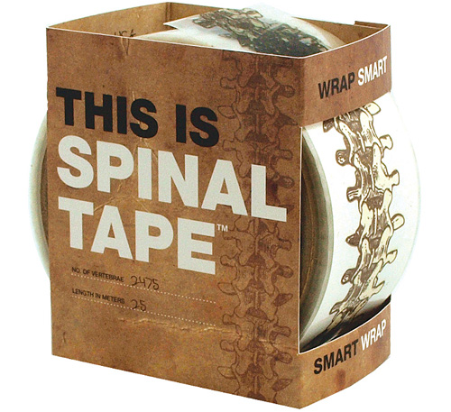Look at this wonderful product shot. have a mild chuckle to yourself, now find a new story. I just saved you 8 dollars. That is what this roll of gag tape costs. 82 feet of a printed contiguous spinal cord. Vertebrae  after vertebrae and not a single 11.